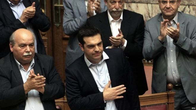 Mr Tsipras' motion on a referendum easily won backing in the 300-member strong parliament, with at least 179 MPs voting in favour of it in the early hours of Sunday.
